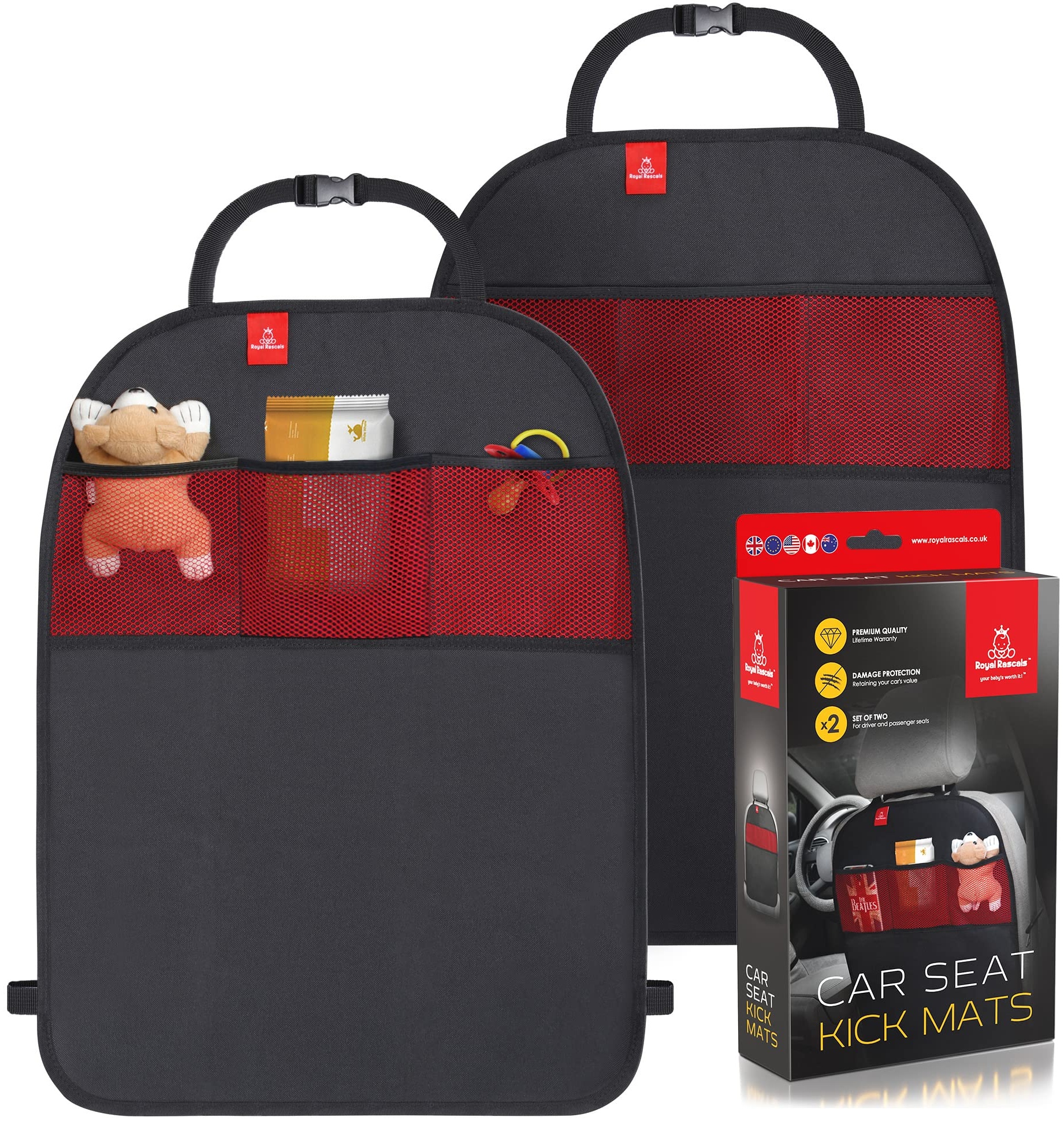 | Name | Royal Rascals – Tretmatten für das Auto, 2 Stück | Autositz-Polsterschutz | Ordnungssystem mit Taschen | Universalgröße | belastbar und bietet Schutz vor Flecken |
