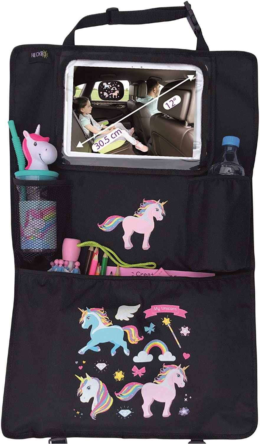 KINDGERECHTES MOTIV: Auf diesem schwarzen HECKBO Autositz Organizer ist ein cooles Motiv mit verschiedenen Einhörnern in bunten und kräftigen Farben aufgedruckt - ein Must-Have für alle Kinder die Einhörner lieben. Praktisches Reise Zubehör für Sie und Ihr Kind. VERSTELLBARE WINKELHALTERUNG – FÜR BESSERE SICHT AUF DAS TABLET: Für unseren Autoorganisator haben wir uns etwas ganz Besonderes einfallen lassen. Die Tablet Halterung Auto kann mit Hilfe der verstellbaren Winkelhalterung und des starken Kletts flexibel an fast jede Neigung des Sitzes angepasst werden. Somit hat ihr Kind immer den besten Blick auf das Tablet und Sie können sich während der Autofahrt bequem zurücklehnen. THERMOTASCHE & NETZTASCHE: An unserem Auto Organizer haben wir zudem eine Kühltasche angebracht, in der Getränke auch auf längeren Autofahrten kühl bzw. warm gehalten werden können. In dieser Isoliertasche kann die Trinkflasche verschiedener Größen verstaut werden. Zudem können Getränke oder weitere Sachen auch in die Stretch-Netztasche reingepackt werden. EXTRA GR Oß E TASCHE MIT GUMMI & KLETTVERSCHLUSS: Auf langen Autofahrten müssen auch mal größere Gegenstände wie Bücher, Spiele, Feuchttücher oder Spielzeug verstaut werden. Hierfür haben wir im unteren Bereich des Rückenlehne Organizer eine Aufbewahrungstasche angebracht, die sich aufgrund des Klettverschlusses sicher verschließen lässt. Zu diesem Motiv bieten wir übrigens auch passende Sonnenblenden, Turnbeutel sowie Gurtschutz und Gurtkissen an EINFACHE BEFESTIGUNG AM AUTOSITZ: Der Kinder Auto Rücksitz Organizer kann kinderleicht an der Kopfstütze mit einem Klettverschluss fixiert und mit stabilen Haken unter dem Sitz verankert werden. Die elastischen Bänder sorgen dafür, dass der Sitzschutz sich bestmöglich an den Sitz anpassen kann. Der Autositzschutz besteht aus schmutzabweisendem, pflegeleichtem Material und lässt sich daher einfach mit einem feuchten Schwamm sauber machen.