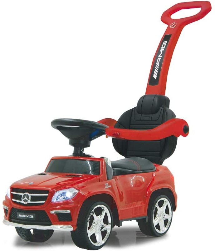 Für die Kleinsten in der Familie hat Jamara-Kids das ideale, kindgerechte Fahrzeug. Der offiziell lizenzierte Mercedes-AMG GL 63 bietet dank der stabilen und liebevoll gestalteten Karosserie ein sicheres Fahrvergnügen. Dafür sorgen auch die niedrige Sitzhöhe von 250 mm und der eigens konstruierte Kippschutz am hinteren Ende des Rutschautos. Mit dem griffigen Lenkrad mit Hupe, echten Scheinwerfer und den - dem Original nachempfundenen – Kühlergrill und Felgen, ist der Mercedes-Rutscher das ideale Fahrzeug für die kleinsten Entdecker – gleichermaßen Indoor wie Outdoor. In der 2in1 Version gibt es noch einen Schub- und Haltegriff für den Rutscher. Damit können auch die Kleinsten bequem und dank des seitlichen Schutzbügels sicher geschoben werden. **Highlights:** - Kippschutz - Flüsterreifen - Kofferraum unter der Sitzfläche - Kunstledersitz mit roten Ziernähten - Startknopf mit Motorsound - Beleuchtete Armatur - Schub- und Haltestange mit Rückenlehne und seitlichen Schutzbügel - Schub- und Haltestange abnehmbar - Licht vorne und hinten - bis max. 23 kg belastbar - Hupe am Lenkrad - Originalgetreue Optik **Produktdetails:** - Empfohlenes Zubehör: 4 x AA-Batterien 1,5V - Abmessungen: 89,00 × 36,00 × 85,00 cm - Gewicht: 5,14 kg