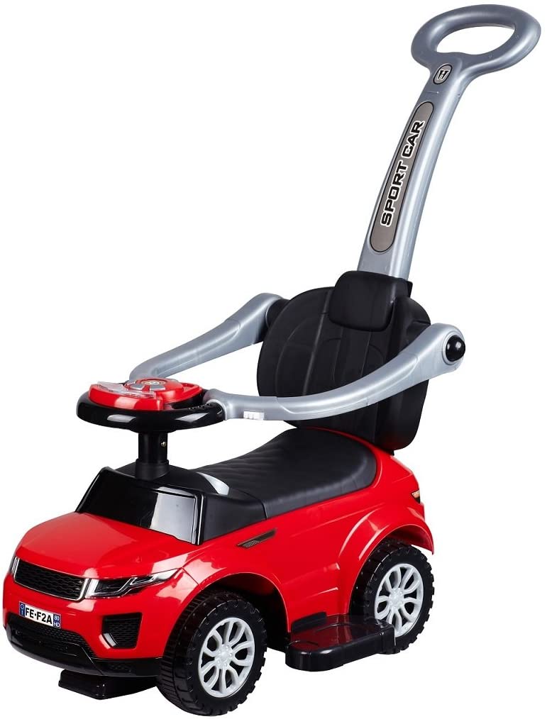 Das Rutschauto bietet Ihrem Kind viel Spaß und erstes Fahrvergnügen. Das griffige Lenkrad ist ideal für kleine Kinderhände. Abwechslung beim Fahren bieten die Musik und das Licht (steuerbar am Lenkrad). Die Kunststoffräder sind geeignet für Fahrten im Haus und draußen. Eine abnehmbare Schiebestange ist ideal für bequeme Ausfahrten. Sicherheitsbügel und Fußablage sorgen für die notwendige Sicherheit und können abmontiert werden, wenn das Kind größer ist. Achtung: Nur unter Aufsicht eines Erwachsenen verwenden! **Produktdetails:** - Material: Kunststoff, PP - Maß inklusive Stange: ca. 85 x 43 x 85,5 cm (L x B x H) - Sitzhöhe: ca. 24,5 cm - Durchmesser Räder: 14 cm - Autofarbe: rot - Empfohlenes Alter: 12-36 Monate - Maximales Belastungsgewicht: 27 kg - Benötigte Batterien für Sound-Lenkrad: 2 x AA (nicht im Lieferumfang enthalten)