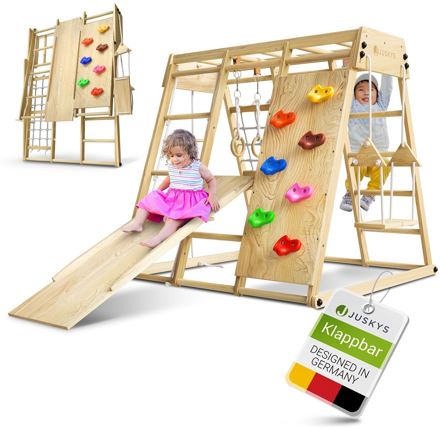 | Name | Juskys 'Maxi' Klettergerüst für Kinder - Indoor Spielplatz mit Rutsche, Kletterwand, Kletternetz & Schaukel - Holz Kletterturm klappbar - Holz Natur, 119 x 124 x 119 cm |