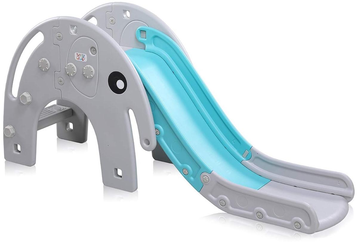 Die Baby Vivo Kinderrutsche in der Form eines Elefanten bietet packenden Spielspaß für Kinder ab 2 Jahren. Mit einer maximalen Belastbarkeit von bis zu 70 kg und den kompakten Gesamtmaßen von 163 x 42 x 75 cm (LxBxH) ist sie ideal für drinnen und draußen. Die Rutsche fördert spielerisch die Motorik und den Gleichgewichtssinn der Kleinen und sorgt für unvergessliche Abenteuer. **Highlights** - Geeignet für Kinder ab 2 Jahren - Maximale Belastbarkeit bis ca. 70 kg - Geprüft und getestet nach EN 71-1,2,3 und 8 - Einfache und schnelle Montage - Hergestellt aus hochwertigem und beständigem Polyethylen **Produkteigenschaften** - Gesamtmaße im aufgebauten Zustand: 163 x 42 x 75 cm (LxBxH) - Maße der Rutsche: 130 x 33,5 cm (LxB) - Maße der Plattform: 26,5 x 36 cm (LxB) - Maße der kleinen Stufen: 12 x 36 cm (LxB) - Stehhöhen: 1. Stufe ca. 18 cm, 2. Stufe ca. 36 cm, Plattform ca. 54,5 cm - Sehr stabil, Rutsche wird fest mit Gestell verschraubt - Abgerundete Ecken und Kanten für maximale Sicherheit