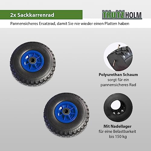 Die TRUTZHOLM Sackkarrenräder aus Vollgummi sind eine praktische und wartungsarme Alternative zu Schlauchreifen. Sie bieten eine einfache Montage und sind langlebig, jedoch sind sie härter und dämpfen Unebenheiten nicht gut.