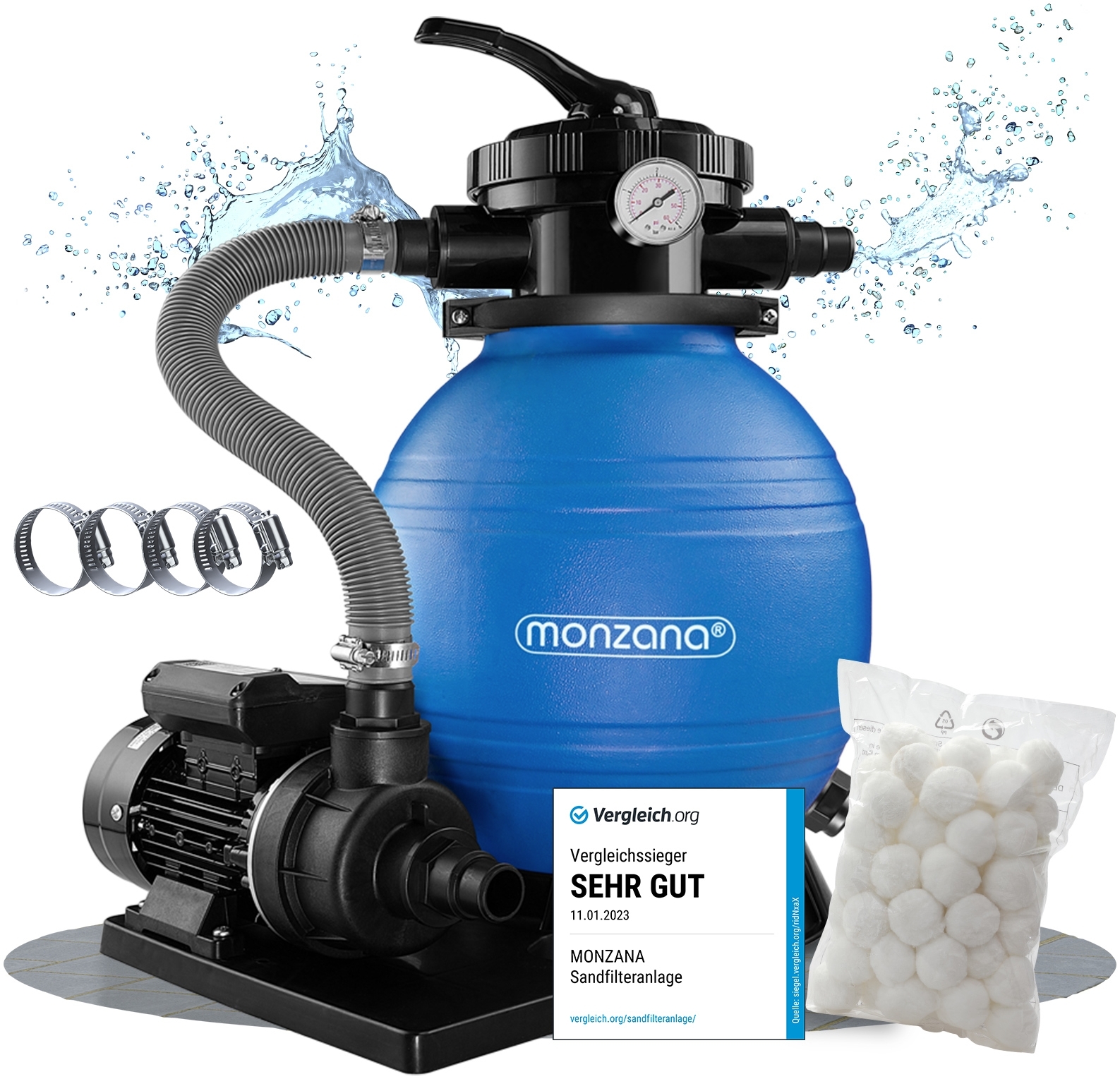 | Lieferumfang | 1x Sandfilteranlage, 1x Pumpe, 1x Betriebsanleitung, 1,2x kg Filterbälle, 4x zusätzliche Schlauchschellen |