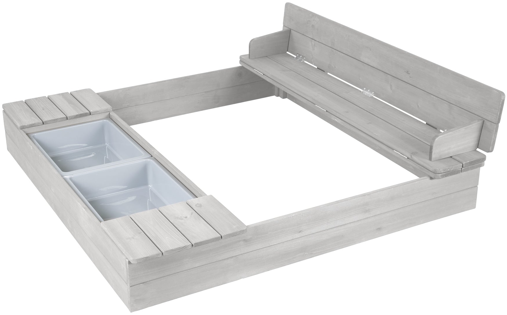 Der roba Sandkasten 'Outdoor+' mit aufklappbarer Sitzbank sowie zwei Spielwannen ist aus wetterfestem und umweltfreundlichem Massivholz gefertigt. Um die Wetterbeständigkeit zu gewährleisten, wurde das Holz aus nachhaltiger Forstwirtschaft zum Schutz grau lasiert. Durch das clevere Design lässt sich der Sandkasten vollständig bedecken, wenn er nicht benutzt wird. Dadurch lässt sich der Sand stets vor äußeren Einflüssen schützen. Wenn Sie die Sitzbank ausklappen, verwandelt sich der Sitzplatz in eine wunderbare Sitzbank für Ihre Kinder, die perfekt für Verschnaufpausen geeignet ist. Im Lieferumfang sind, neben dem Sandkasten und der ausklappbaren Sitzbank, zwei Spielwannen aus Kunststoff (HxBxT: 9,5x38x31,5cm) und vier abnehmbare Sitzplatten enthalten. Zusätzlich bieten zwei Staufächer genügend Raum für die Aufbewahrung von Spielzeug. Der Sandkasten ist kindgerecht und sicher gefertigt. So sind keine Schrauben auf den Sitzflächen sichtbar, eventuell scharfe Holzkanten sind abgerundet – so steht dem Spielspaß nichts mehr im Wege. Der quadratische Sandkasten ist insgesamt 120 cm lang, 125 cm breit und 18 cm hoch. Die Höhe im ausgeklappten Zustand beträgt 40cm.