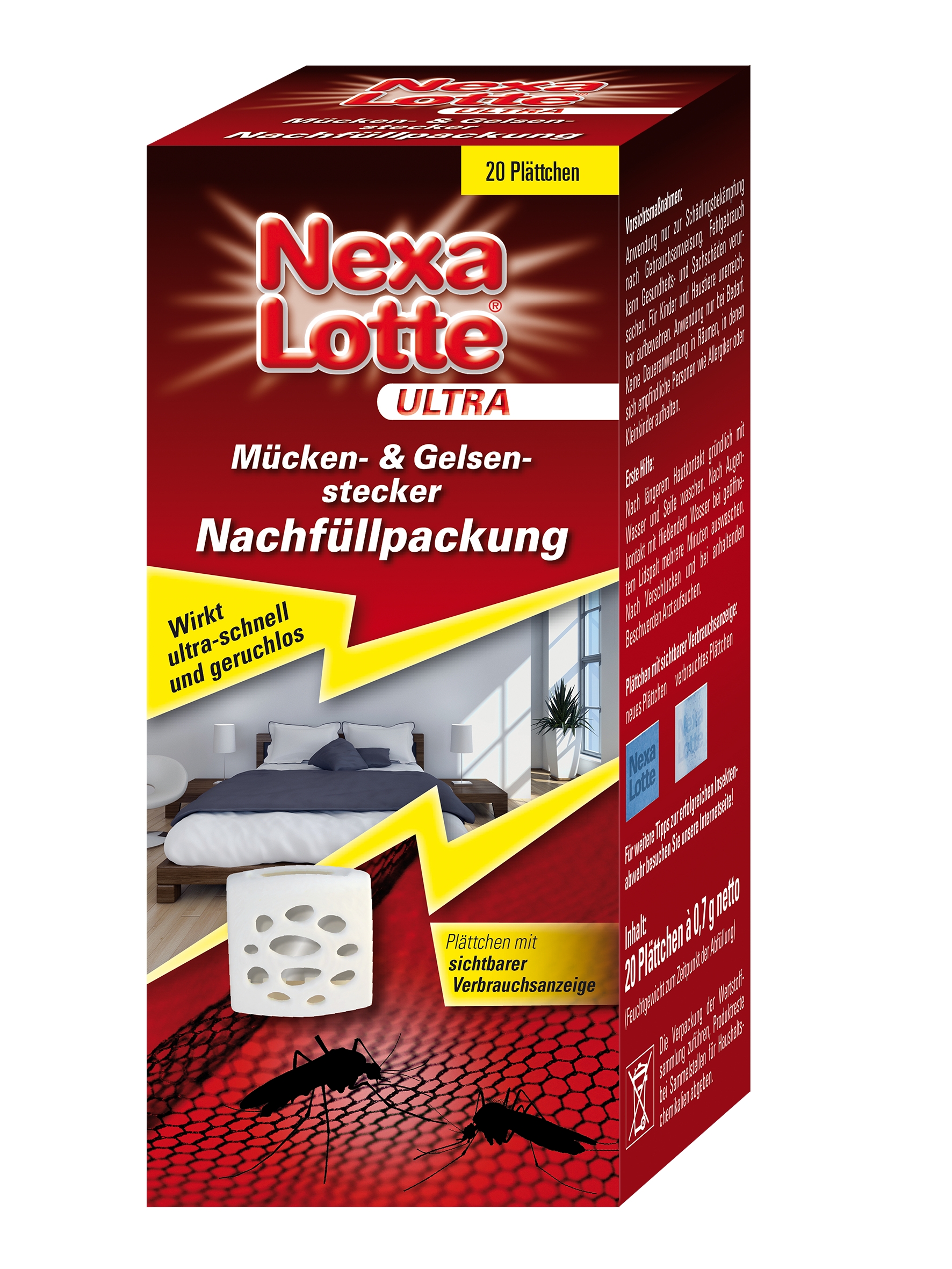 Die NEXA LOTTE Ultra Mücken- & Gelsenstecker Nachfüllpackung bietet effektiven Schutz vor lästigen Mücken und Gelsen. Dank der einfachen Anwendung können Sie ganz unbeschwert die warmen Sommerabende im Freien genießen, ohne von den Insekten gestört zu werden. Zudem überzeugt das Produkt durch das Fehlen unangenehmer Gerüche.