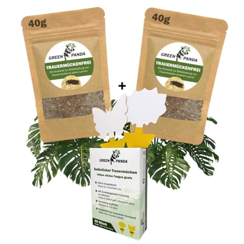 GreenPanda Bio Trauermückenfrei - Effektiv Larven in Erde & Trauermücken bekämpfen - 2in1 Mittel gegen Trauermücken - 2x 40g Anti-Larven Pulversubstrat + 50 Gelbsticker (Set-3tlg.)