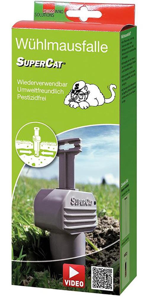 "Mit der Supercat-Schlagfalle von Swissinno lassen sich Wühlmäuse gezielt und ohne Gifteinsatz beseitigen."