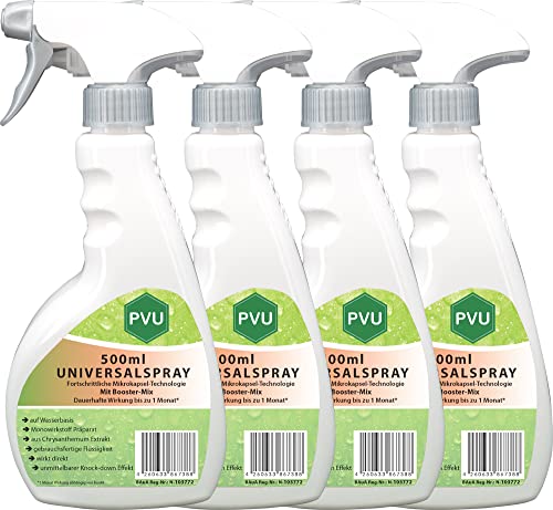 PVU Universal Insekten Spray 4x500ml Mit Booster Mix gegen Insekten & Ungeziefer Innen und Außen auf WasserbasisHochwirksames Insekten-Spray aus reinem Chrysanthemum Extrakt - Formuliert in Deutschland