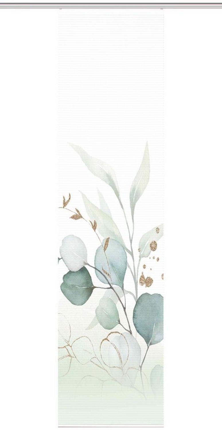 HOME in green Schiebegardine ABANIO ist ein nachhaltiger Vorhang aus recyceltem Polyester, der mit einem floralen Naturmotiv im Aquarell-Stil begeistert. Der halb-transparente Stoff in Bambus-Optik sorgt für eine harmonische Lichtdurchlässigkeit und schützt gleichzeitig vor neugierigen Blicken. Mit einer Höhe von 245 cm und einer Breite von 60 cm lässt sich die Gardine individuell kürzen. **Highlights** - Nachhaltiges Material: Hergestellt aus 91% recyceltem Polyester - Halb-transparent: Feine Querstreifen für Lichtdurchlässigkeit und Sichtschutz - Lasergeschnittene Seiten: Verhindert Ausfransen nach dem Kürzen oder Waschen - Pflegeleicht: Waschbar bei 30° C im Schonwaschgang - Inklusive Zubehör: Paneelwagen, Alu-Klemmschiene und kleines Zubehör **Produkteigenschaften** - Maße (H x B): 245x60 cm - Obermaterial: 91% recyceltes Polyester, 9% Polyester - Pflegehinweis: Bügeln bei Stufe 1, ohne Dampf von links **Lieferumfang** - 1 x Schiebevorhang ABANIO - 1 x Paneelwagen (Gleitschiene oben) - 1 x Alu-Klemmschiene unten - Kleines Zubehör - Hinweis: Gardinenschiene nicht im Lieferumfang enthalten
