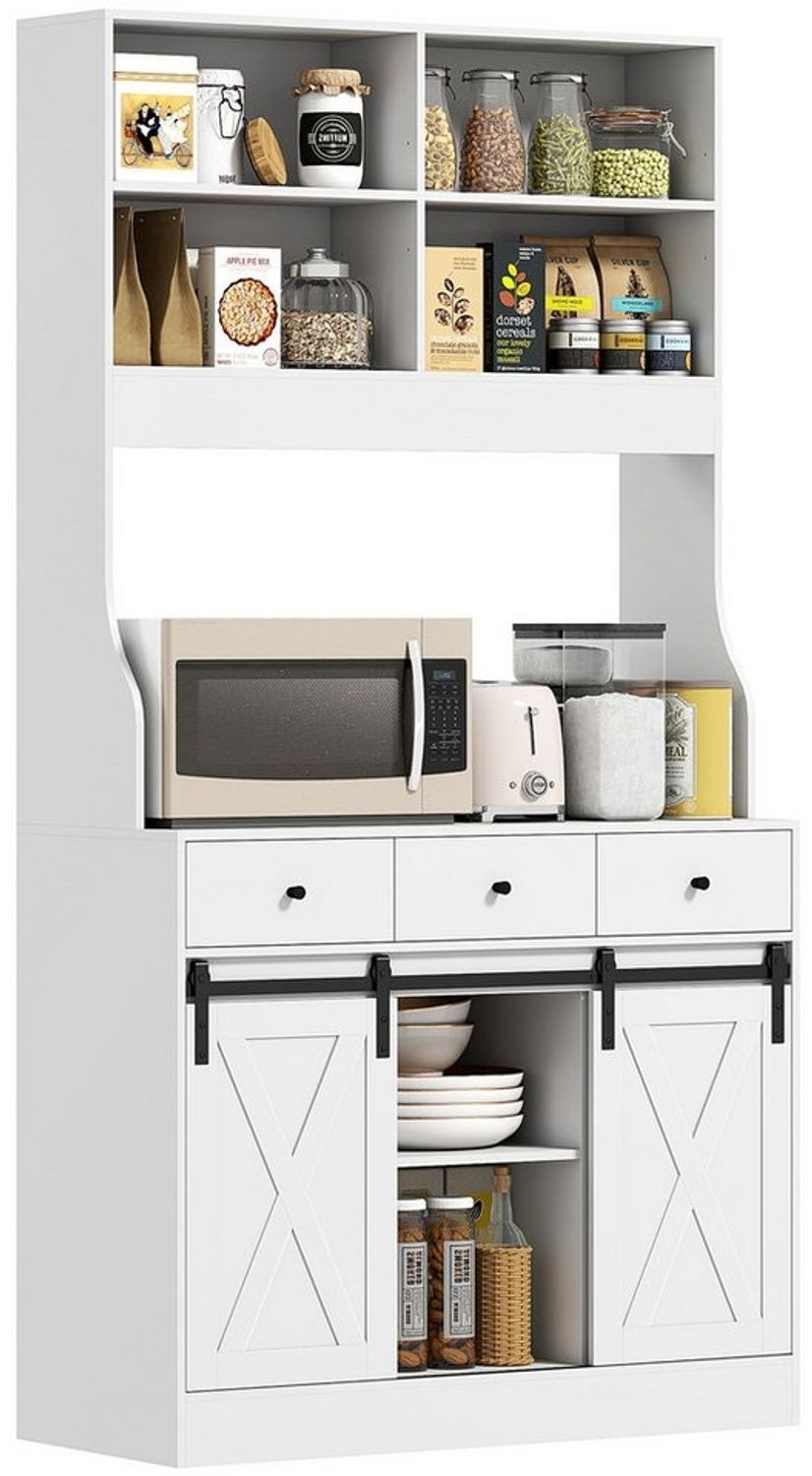 HOMCOM Küchenbuffet mit Arbeitsplatte und Schiebtüren bietet Ihnen eine stilvolle Lösung zur Aufbewahrung in Ihrer Küche oder Ihrem Esszimmer. Mit großzügigen Abmessungen von 93,5 x 40 x 180 cm und einer Belastbarkeit von bis zu 75 kg, bietet dieser Schrank ausreichend Platz für Ihre Küchenutensilien. Die Kombination aus weißem Finish, rustikalen Scheunentoren und schwarzen Akzenten verleiht Ihrem Raum einen charmanten Look. **Highlights** - Sechs offene Fächer für einfache Aufbewahrung - Drei praktische Schubladen für kleinere Gegenstände - Verstellbare Regale für größere Gegenstände - Kippschutzdesign für zusätzliche Sicherheit - Hochwertiger Spanplattenrahmen mit kratzfester Oberfläche **Produkteigenschaften** - Farbe: Weiß - Material: Spanplatte - Gesamtabmessungen: 93,5 x 40 x 180 cm - Größe des oberen Fachs: 45 x 21,8 x 20,2 cm, 45 x 21,8 x 21,8 cm - Innengröße der Schublade: 24,5 x 29 x 6,6 cm - Innengröße des Schranks: 29,5 x 35 x 46,7 cm (unter) - Belastbarkeit: 75 kg (gesamt), 5 kg (Schublade, Regal) **Lieferumfang** - 1 x Küchenschrank - 1 x Handbuch