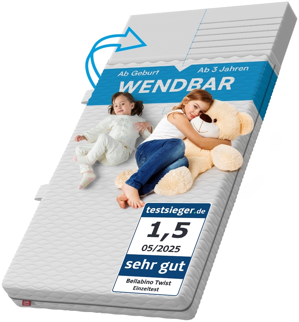 | Beschreibung | **Mitwachsender Komfort ab Geburt** Die Bellabino 'Twist' ist die perfekte Matratze für Babys, Kleinkinder und Jugendliche. Dank zwei wendbarer Seiten mit unterschiedlichen Härtegraden (H1/H2) begleitet sie Ihr Kind vom ersten Tag bis ins Teenageralter (0–13 Jahre) und bietet jederzeit die richtige Unterstützung. **Zwei Seiten für jede Entwicklungsphase** Die Babyseite mit glatter Oberfläche und höherer Festigkeit verhindert das Einsinken – ideal in den ersten Lebensjahren. Ab 2,5 Jahren sorgt die ergonomisch profilierte Kinderseite mit 7-Zonen-Schnitt für optimale Unterstützung von Rücken und Wirbelsäule. **Hygienisch und allergikerfreundlich** Der atmungsaktive Bezug mit Klimawatte besteht aus 100 % Polyester, ist hautfreundlich und allergikergeeignet. Für höchste Hygiene lässt sich der Bezug bequem abnehmen und bei bis zu 60 °C waschen – ideal für den Alltag mit Kind. **Praktisch im Handling** Die Matratze verfügt über einen abnehmbaren Bezug mit umlaufendem 3-seitigem Zipper und zwei stabilen Wendegriffen. Das erleichtert das Wechseln, Wenden und Reinigen – schnell und unkompliziert im Familienalltag. **Hochwertige Materialien für lange Lebensdauer** Der Kaltschaumkern (RG30) ist langlebig, formstabil und garantiert eine gleichmäßige Stützkraft über Jahre hinweg. Die Kombination aus Qualität und durchdachtem Design erfüllt höchste Ansprüche an Schlafkomfort und Sicherheit. **Produktdetails:** - Maße: 120 x 200 x 15 cm - Kern: Premium-Kaltschaum RG30 - Mitwachsende Nutzung: ab Geburt bis 13 Jahre - Härtegrade: H1 (Baby), H2 (Kind) - Bezug: 100 % Polyester mit Klimawatte, waschbar bis 60 °C - Bezug abnehmbar mit 3-seitigem Zipper und zwei Wendegriffen - 2 Wendegriffe - Allergikerfreundlich, atmungsaktiv, hautfreundlich |