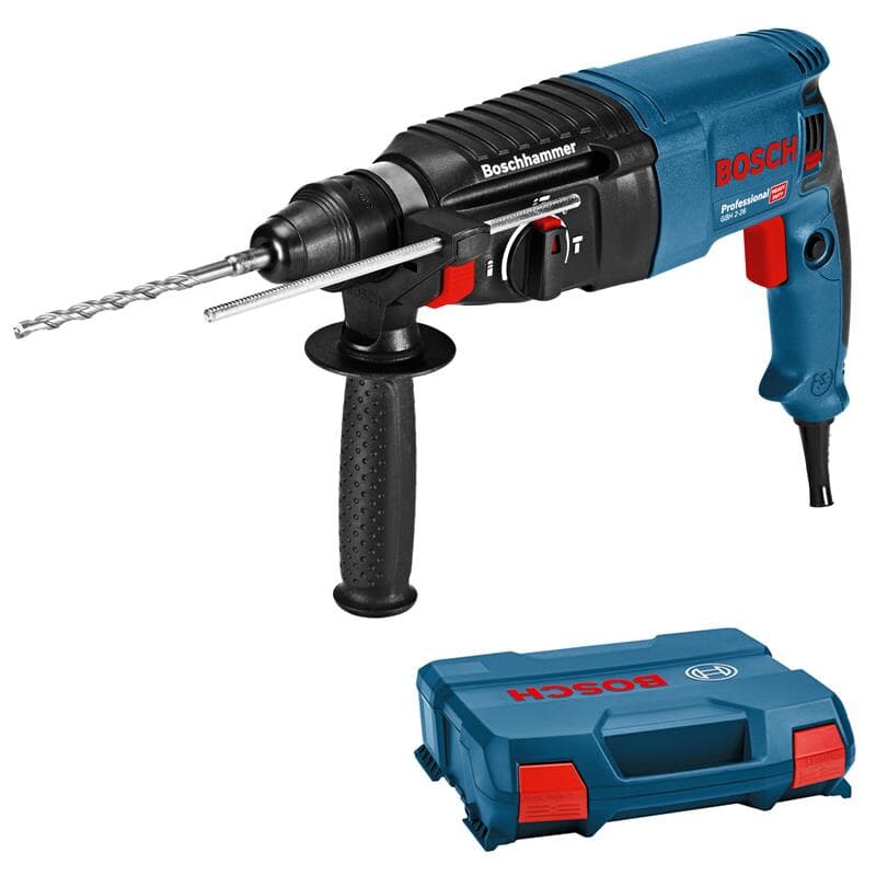 Der Bosch Professional Bohrhammer GBH 2-26 mit Tiefenanschlag ist ein leistungsstarkes Werkzeug für anspruchsvolle Aufgaben im Bereich des Bauens und Renovierens. Mit dem SDS-Bohrfutter bleibt der Bohrer in jeder Situation sicher an Ort und Stelle, während die verschiedenen Bohrmodi und variable Geschwindigkeit eine schnelles Arbeiten ermöglichen. Der Hammer eignet sich ideal zum Entfernen von Fliesen oder Putz sowie zum Zertrümmern von Ziegeln.