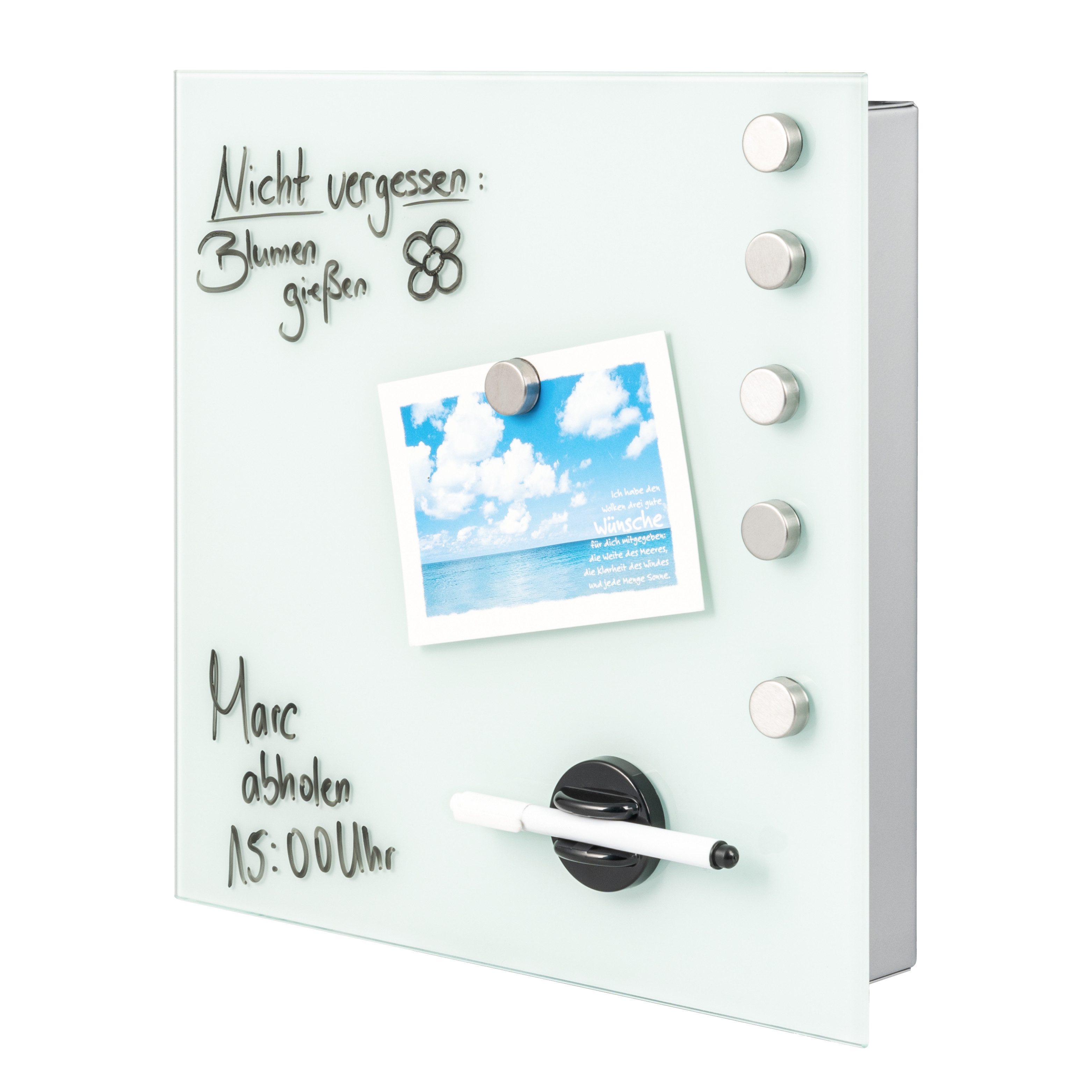 • Die Glasfront dient auch als beschreibbares Memo-Board und wird mit 2 Markern, 1 Markerhalter und 6 Magneten geliefert