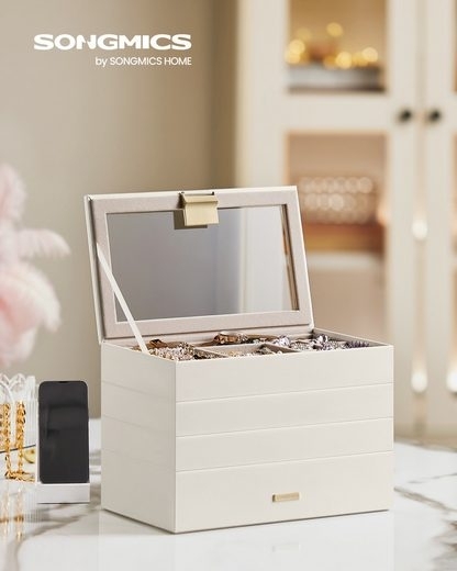 **\[4 frei kombinierbare Ebenen mit viel Stauraum\]** In der großen box können Sie verschiedene Juwelen aufbewahren. In die erhöhte unterste Ebene passen problemlos Brillen und Uhren. Außerdem lassen sich die 4 flexiblen Ebenen nach Bedarf kombinieren **\[Durchdachte Details\]** Der durchsichtige Glasdeckel schafft Stil, hilft Ihnen, den richtigen schnell zu finden, und schützt vor Staub. Dank der Vertiefungen an der Unterseite lassen sich die Ebenen stabil und platzsparend übereinanderstapeln **\[Schick, langlebig und schützend\]** Die weiße Oberfläche, der goldene Metallgriff und die ordentlichen Nähte verleihen dem kästchen eine moderne Note, während die robusten, langlebigen MDF-Platten und das weiche Samtfutter Ihren schützen **\[Vielseitig\]** Der kasten mit 4 Ebenen passt auf den Schminktisch im Schlafzimmer, in die Schubladen oder in den Kleiderschrank, um Ohrringe, Halsketten, Ringe, Armbänder, Broschen und andere Accessoires unterzubringen. Praktische aufbewahrung! **\[Optimale Geschenkidee\]** Schenken Sie Ihren Liebsten oder Freunden diese stilvolle und praktische schatulle zum Geburtstag oder Jubiläum und bereiten Sie ihnen eine süße Überraschung. Oder gönnen Sie sie sich einfach selbst, Sie verdienen es! Mit den stilvollen, klassischen kästchen der SONGMICS aufbewahrungsserie lassen sich all Ihre funkelnden stücke gut aufbewahren und schützen. Jedes Mal, wenn Sie Ihre box öffnen, bietet sich ein schöner Anblick, als würden Sie eine Schatztruhe öffnen. Gönnen Sie sich eine box von SONGMICS, die für Selbstliebe, Selbstvertrauen und das Streben nach einem besseren Leben steht. **Die Highlights der box im Überblick:** - 4 Ebenen mit viel Stauraum: Für verschiedene stücke und Accessoires. - Flexible tabletts: Lassen sich frei kombinieren oder separat in den Schubladen und auf dem Schminktisch benutzen. - Stabil stapelbar: Dank der Vertiefungen an der Unterseite lassen sich die Ebenen wackelfrei übereinanderstapeln. - Stilvoller Glasdeckel: Sehen Sie Ihre stücke auf der obersten Ebene auf einen Blick. - Abnehmbare Trennwände: Bewahren Sie unterschiedlich große stücke auf. **Produktdetails:** - Farbe: Weiß - Material: MDF (Mitteldichte Faserplatte), PU (Polyurethan), Samt - Größe insgesamt (mit der Stärke des Metallgriffs): 17 x 28 x 18,3 cm (T x B x H) - Die 1. Ebene: 17 x 28 x 5,3 cm (T x B x H) - Die 2. Ebene: 17 x 28 x 3,5 cm (T x B x H) - Die 3. Ebene: 17 x 28 x 3,5 cm (T x B x H) - Die 4. Ebene: 17 x 28 x 6 cm (T x B x H) - Gewicht: 1,8 kg **Lieferumfang:** - 1 x kasten **SONGMICS Hinweise:** - Setzen Sie die box keiner direkten Sonneneinstrahlung aus und nutzen Sie sie nicht in einer feuchten Umgebung. - Achten Sie darauf, die Oberfläche des einsatzes für Schubladen nicht mit scharfen Gegenständen zu zerkratzen. - Wir empfehlen, die genauen Abmessungen der box zu überprüfen, um sicherzustellen, dass sie passt. - Wischen Sie die box zur Reinigung leicht ab. Verwenden Sie kein zu nasses Tuch.
