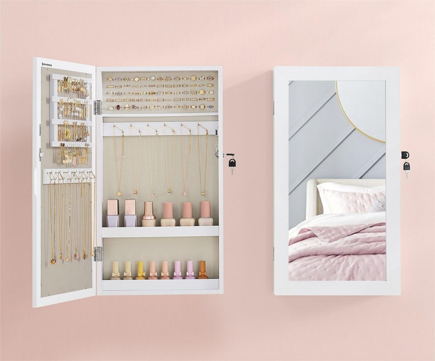 | Name | Songmics Schmuckschrank, Spiegelschrank, Hängeschrank, abschließbarer Wandschrank, platzsparender Schmuckorganizer, Oberfläche in Weiß, Innenfutter in Greige JJCDE051W02 |