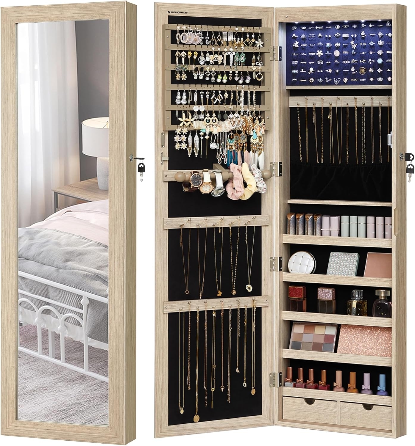| Name | Songmics Schmuckschrank hängend, abschließbarer Spiegelschrank, Wandschrank mit Spiegel und zahlreichen Fächern, Wandmontage, an der Tür hängend, für Ketten, Ohrringe, eichefarben |