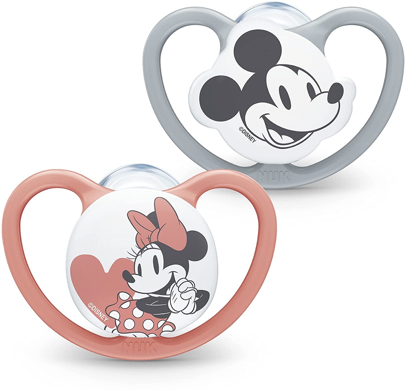 | Name | NUK Space Schnuller | 0–6 Monate | Schnuller mit extra Belüftung | BPA-freies Silikon | Disney Mickey Maus | grau und rosa | 2 Stück |