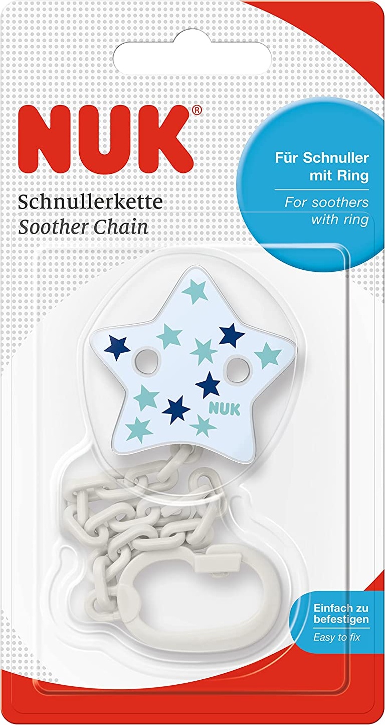 | Name | NUK Schnullerkette mit Schnuller-Clip | für Schnuller mit Ring | robust und bruchsicher | blau mit Stern |