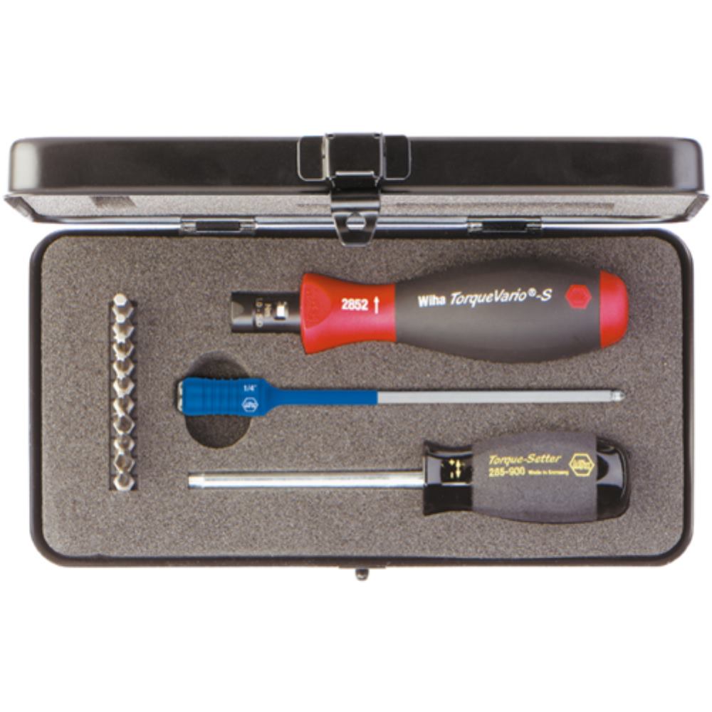 Das Wiha Drehmoment-Schraubendreher Set TorqueVario-S (26893) ist ein hochwertiges Werkzeug, das einfach und genau einstellbar ist und zuverlässig auslöst. Es wird in einer wertigen Metallbox geliefert.