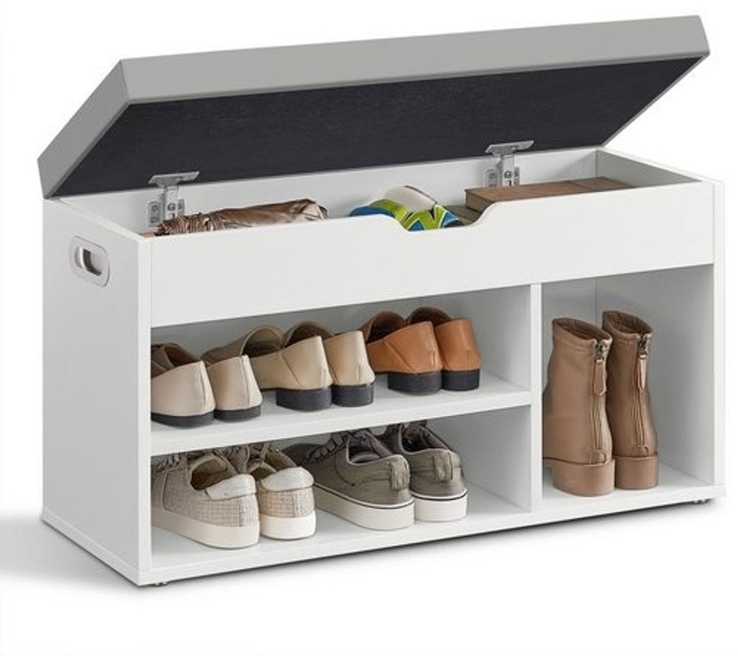 **Vielseitig einsetzbar** Werten Sie Ihren Raum mit dieser Schuhbank auf! Ob im Studentenwohnheim, Apartment, Flur oder Schlafzimmer, diese Sitzbank mit Stauraum passt zu Ihrem Einrichtungsstil und sorgt für Ordnung und eine einladende Atmosphäre. **Geräumig** Diese 30 x 80 x 44 cm (T x B x H) große Schuhbank hat ein 7 cm hohes Fach unter der Sitzfläche, in dem Sie Handschuhe, Bücher etc. verstauen können. Die unteren offenen Fächer bieten Platz für bis zu 6 Paar Schuhe oder Ihre Sportausrüstung. **Robust und langlebig** Aus hochwertigen 15 mm Spanplatten gefertigt, ist diese Bank mit Stauraum robust und mit bis zu 150 kg belastbar. Sie wackelt und quietscht nicht und wird Sie über viele Jahre hinweg begleiten. **Bequemes Sitzkissen** Die Schuhbank für den Flur hat ein 4 cm dickes Kissen, das mit Schaumstoff gepolstert und mit strapazierfähigem und pflegeleichtem PU bezogen ist, und bietet einen gemütlichen Sitzplatz, um Schuhe anzuziehen oder sich zu entspannen. **Durchdachte Details** Die Garderobenbank ist mit 2 robusten Scharnieren aus einer Legierung ausgestattet, die für Stabilität sorgen und verhindern, dass sich der Deckel plötzlich schließt. Dank 2 seitlichen Griffen lässt sich die Polsterbank leicht bewegen. Produktdetails: - Material: Holzspanplatte, Schaumstoff, PU (Polyurethan) - Größe: 30 x 80 x 44 cm (T x B x H) - Gewicht: 14,6 kg - Max. statische Belastbarkeit: 150 kg Lieferumfang: - 1 x Sitzbank mit Schuhregal - 1 x Zubehörpaket - 1 x Anleitung VASAGLE Hinweise: - Die maximale statische Belastbarkeit der Bank beträgt 150 kg. Bitte überschreiten Sie dieses Maximalgewicht nicht.