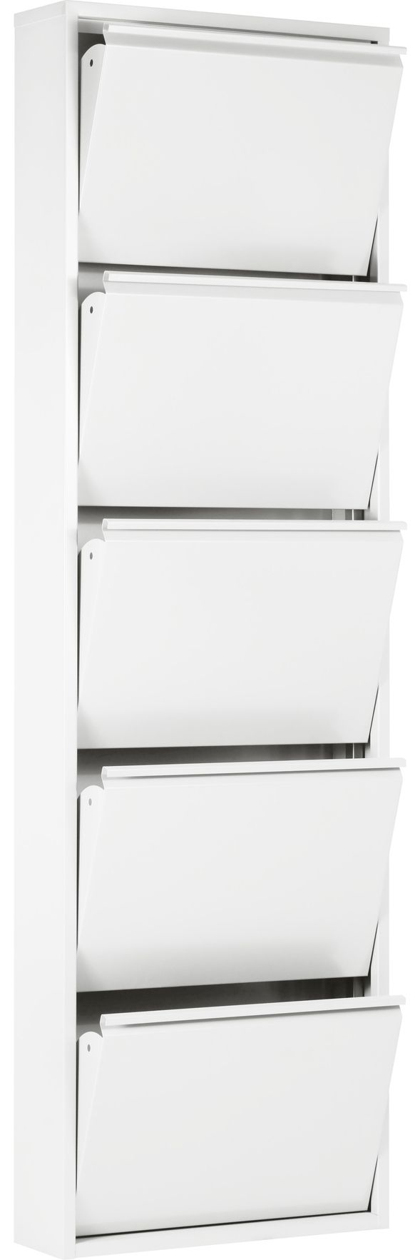 Der Schuhkipper WIT in Weiß vereint modernes Design mit hoher Funktionalität. Mit kompakten Maßen von 50 x 172 x 15 cm (BxHxT) ist er ideal für schmale Flure und kleinere Wohnungen. Fünf praktische Klappen bieten Platz für bis zu ca. 8 Paar Schuhe und schützen diese vor Staub. Die glatte, weiße Lackierung auf robustem Metall sorgt für Pflegeleichtigkeit und eine elegante Optik. Der Schuhkipper wird komplett montiert geliefert und ist sofort einsatzbereit. **Highlights** - Modernes Design, das sich harmonisch in verschiedene Einrichtungsstile integriert - Fünf Klappen für bis zu ca. 8 Paar Schuhe, ordentlich und griffbereit verstaut - Pflegeleichte, kratzfeste Oberfläche für einfachen Reinigung - Hohe Stabilität durch robustes Metall, ohne wuchtig zu wirken - Komplett montiert geliefert, sofort einsatzbereit **Produkteigenschaften** - Maße (BxHxT): 50 x 172 x 15 cm - Farbe: Weiß - Material: Metall - Klappen: 5 - Stauraum für ca. 8 Paar Schuhe **Lieferumfang** - Schuhkipper WIT, komplett montiert - Kein Werkzeug erforderlich