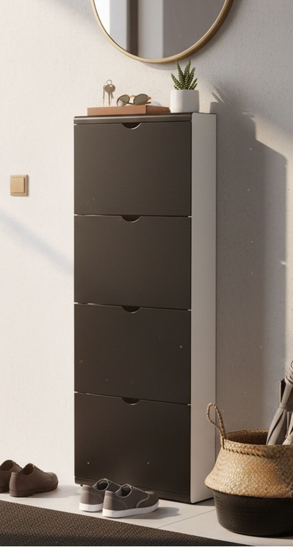 Der Schuhkipper 304987 bietet eine durchdachte Lösung zur ordentlichen Aufbewahrung von Schuhen und eignet sich ideal für Flur, Diele oder Eingangsbereich. Mit seinen kompakten Maßen von 52 x 141 x 16 cm nutzt er den vorhandenen Raum effizient und bietet Platz für ca. 16 Schuhe. Die Kombination aus schwarzer Stahlfront und weißem Korpus verleiht ihm eine moderne Optik. Gefertigt aus stabilen Materialien, ist er pflegeleicht und sofort einsatzbereit. **Highlights** - Platz für ca. 16 Schuhe (8 Paar) - Moderne Kombination aus schwarzer Stahlfront und weißem Korpus - Pflegeleichter Holzwerkstoff für den täglichen Gebrauch - Integrierte Magnetschnapper für sicheren und einfachen Zugriff - Lieferung im aufgebauten Zustand **Produkteigenschaften** - Maße (BxHxT): 52 x 141 x 16 cm - Material: Stahl / Holzwerkstoff (Spanplatte) - Hergestellt in Deutschland - Schmale Tiefe von 16 cm für unauffällige Integration in den Raum **Lieferumfang** - Schuhkipper 304987 im aufgebauten Zustand - Exklusive Schuhe und weiteres Zubehör