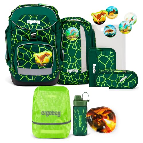 ergobag Pack Bundle Schulrucksack Set 9-teilig BärRex 2024 + TrinkflascheRegencape & LED Klettie, ergonomisch, standfest, reflektierend, individualisierbar