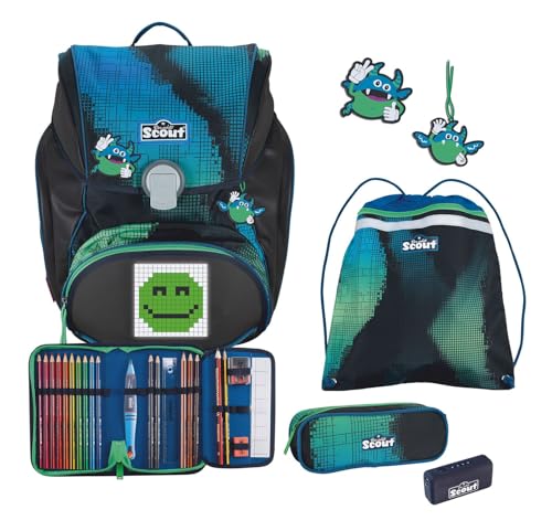 Der echte Scout Alpha Set Movie Star Blue Pixel Set 5-teiligca. 20 l Volumen, ca. 1.350 g Gewicht (ohne abnehmbare Elemente) - Schulranzen-Set mit pixeliger Kunst und Sicherheitsfeatures
