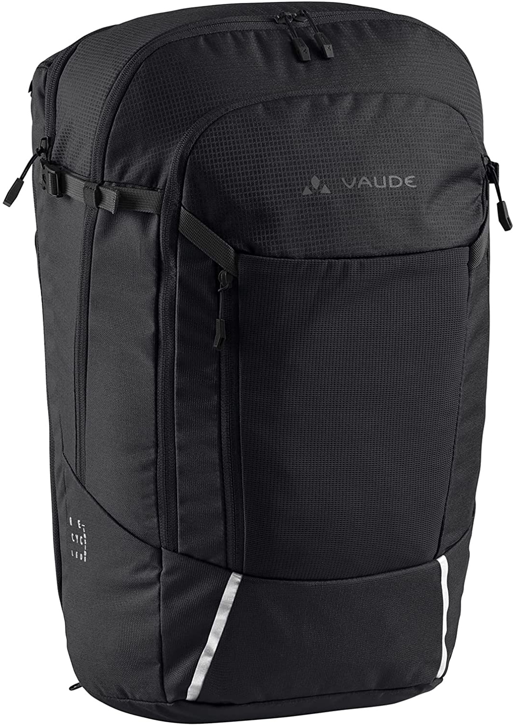 2in1 Gepäckträgertasche und Rucksack Rucksack oder Radtasche? Beides! Der Cycle 28 ist der ideale Begleiter für Commuter, die während der Fahrt einen sicheren Sitz der Tasche am Rad wünschen, sie dann aber in Bahn und Bus oder der Uni als Rucksack tragen möchten. Die Tasche wird über die mit einem Schloss absperrbaren QMR-Haken (z. B. Abus 145/20, nicht im Lieferumfang enthalten) am Gepäckträger befestigt und ist im Handumdrehen zum Rucksack umgebaut. Dazu werden die beiden vertikalen Reißverschlüsse geöffnet und das gesamte Befestigungssystem in einem mit Klett verschlossenen Fach verstaut. Die Umbaufunktion wird auf einem eingenähten, leicht entfernbaren Etikett in wenigen Schritten erläutert. Die clevere Rucksack-Radtaschen-Kombination bietet aber noch mehr. Im Vergleich zum kleineren Bruder Cycle 20 deutlich größerem Hauptfach findet neben DIN A4 Unterlagen, Trinkflasche und Brotzeit auch Wechselwäsche Platz. Ein separates, mit Reißverschluss verschlossenes, gepolstertes Fach nimmt Laptops bis 15,6“ auf. Ein über die gesamte Front reichendes Fach öffnet diagonal und bietet einen Netzorganizer für Handy, Schlüssel und Geldbeutel. Auf diesem Fach befindet sich zusätzlich eine flache Netztasche für das schnelle Verstauen von Zeitschriften oder nasser Kleidung. Zwei seitliche Kompressionsriemen, ein Helmhalter sowie ansprechend ins Design integrierte reflektierende Elemente runden die Komfortausstattung ab. Das Hauptmaterial des Cycle 20 besteht aus 50 % recyceltem Polyester, das Kontrastmaterial sogar zu 100 %. Unser Verwandlungskünstler ist mit Eco Finish PFC-frei wasserabweisend ausgerüstet. Das VAUDE Green Shape-Label steht für ein umweltfreundliches, funktionelles Produkt aus nachhaltigen Materialien. Material:100% Polyester (davon 50% recycelt) Hauptfach mit Reißverschluss 2 in 1 Rucksack und Gepäckträgertasche Notebookfach für 15,6 Zoll Front-Außentasche mit Netzorganizer verstaubares Befestigungssystem Blinklichthalter reflektierende Elemente