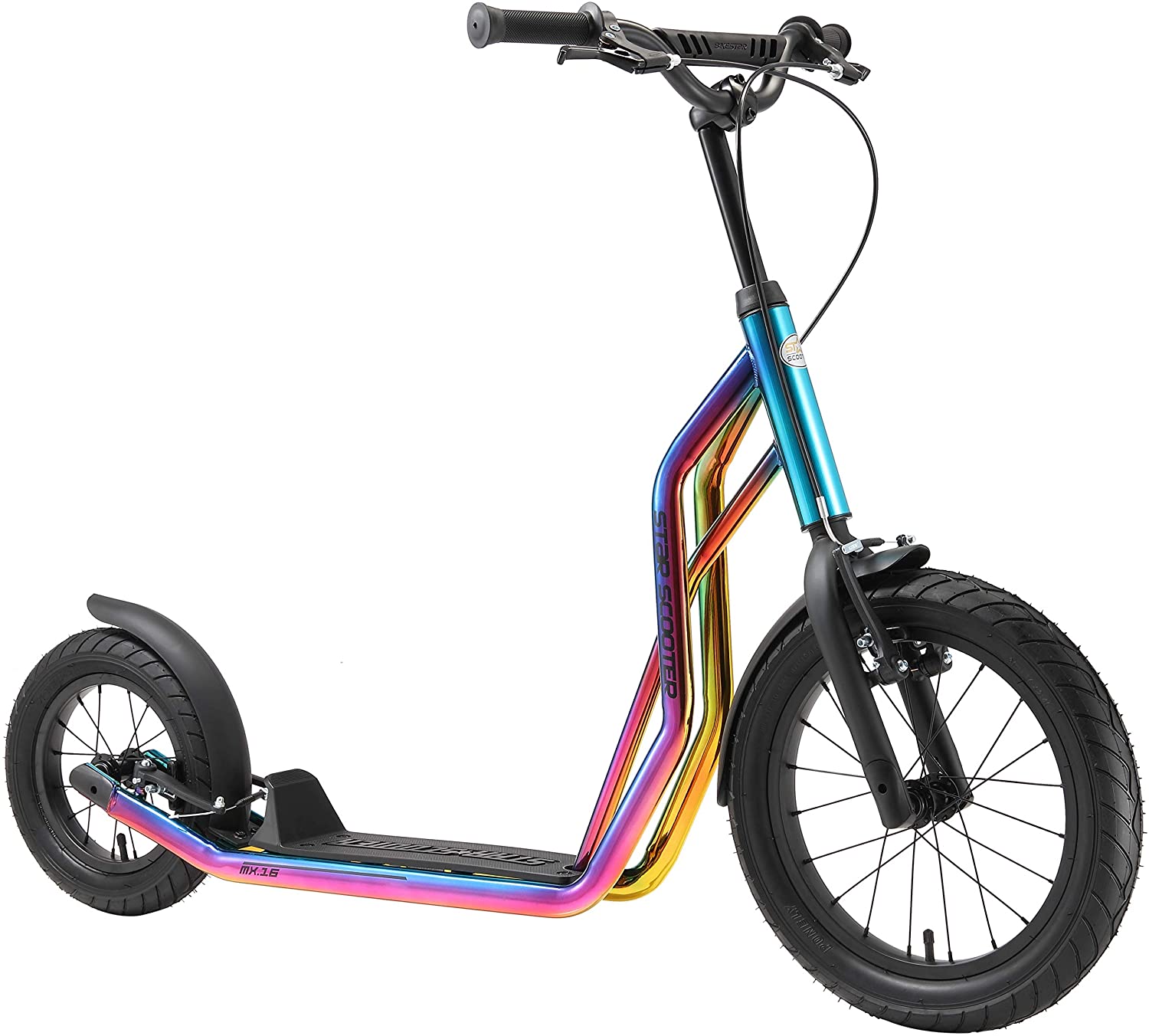 **Altersempfehlung: ab ca. 8 Jahre (ca. 125cm Körpergröße)** Länge: 135 cm | Trittfläche: 35 cm x 11 cm | Lenkerhöhe: 80-96 cm | Lenkerbreite: 56 cm | Gewicht: 9.5 kg INTEGRIERTER STEUERSATZ: Bei diesem Scooter wurde ein integrierter Steuersatz verbaut wodurch sich die Bremskräfte der V-Bremse noch besser übertragen und ein weiches und direktes Lenken möglich wird LANGLEBIG: Wir wissen, Kinder testen ihre Sachen sehr intensiv, deshalb hat unser Roller einen stabilen Stahlrahmen mit schlagfestem Lack. Selbstverständlich achten wir auf giftfreie und unbedenkliche Materialien und die Haltbarkeit der verbauten Teile. Der Lenker kann zudem in Höhe und Neigung angepasst werden LUFTREIFEN: Die extra dicken Luftreifen (hinten 12 Zoll, vorne 16 Zoll) federn perfekt Fahrten über Stock und Stein und jedes Gelände. Durch die ABEC-7 Kugellager wird der Roller leichtgängig und die Felgen aus Aluminium reduzieren das Gewicht des Scooters erheblich - 40.6cm (16 Zoll) Luftreifen vorne, 30.5cm (12 Zoll) Luftreifen hinten - Stabiler, mehrfach beschichteter Stahlrahmen mit schlagfestem Lack - Schutzbleche an den Reifen: Kein Schmutz an der Kleidung - Kindgerechter Bremsgriff der Hinterrad-Handbremse - Leichtgängige Lenkung mit in Höhe & Neigung einstellbarem Lenker - Giftfreie Sicherheitslenkergriffe - Rutschfestes Trittbrett und stabiler Seitenständer - Führung des Bremsseilzuges innerhalb des Rahmens: kein Hängenbleiben