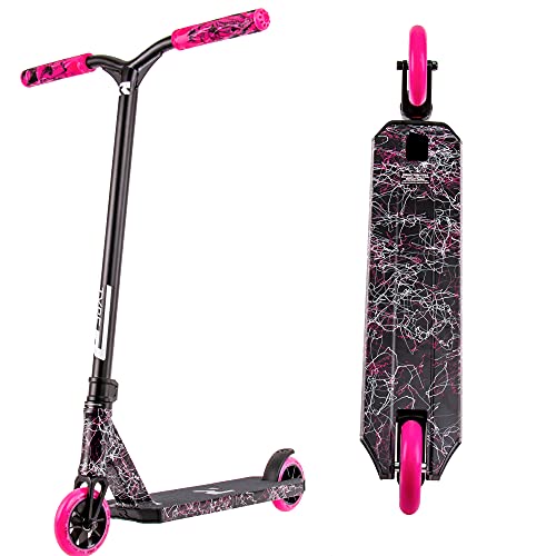 Das auffällige Pink Splatter-Design des Scooters hebt sich deutlich von anderen Modellen ab und macht ihn zu einem echten Blickfang. Die Verwendung von Aluminium 6061 sorgt für ein leichtes und robustes Fahrgefühl, während die 110mm x 24mm 8-Spoke Black PU / Black Core Pro Scooter Wheels eine glatte Fahrt garantieren. Nutzer loben die hochwertige Verarbeitung und die Robustheit des Scooters, was ihn ideal für verschiedene Einsatzbereiche macht, sei es im Park, auf dem Schulweg oder für Tricks.