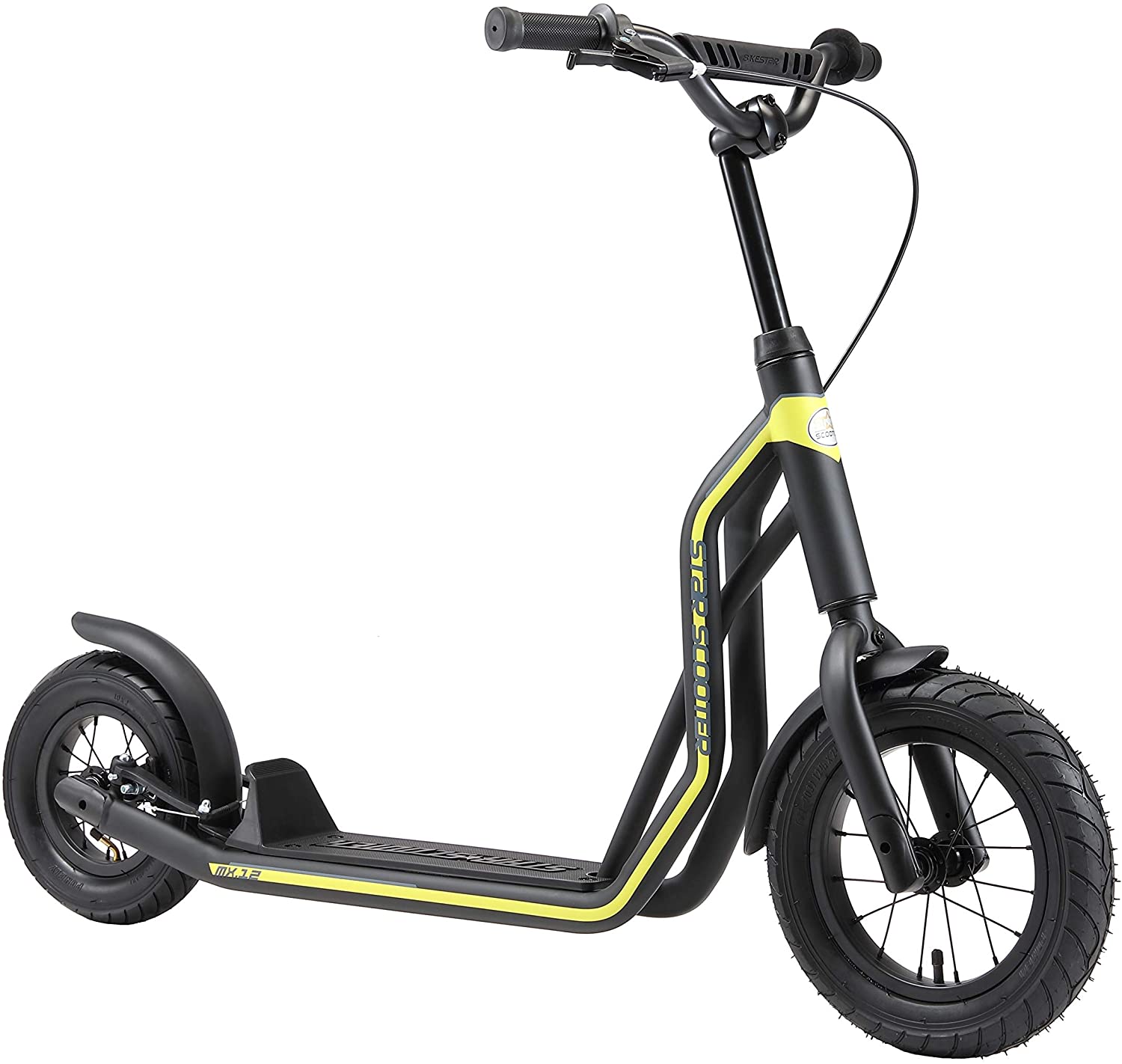 Bikestar Star-Scooter Tretroller 12 Zoll Mixed Bei diesem Scooter wurde ein integrierter Steuersatz verbaut wodurch sich die Bremskräfte der V-Bremse noch besser übertragen und ein weiches und direktes Lenken möglich wird. Kinder testen ihre Sachen sehr intensiv, deshalb hat unser Roller einen stabilen Stahlrahmen mit schlagfestem Lack. Selbstverständlich achten wir auf giftfreie und unbedenkliche Materialien und die Haltbarkeit der verbauten Teile. Der Lenker kann zudem in Höhe und Neigung angepasst werden. Die extra dicken Luftreifen (hinten 10 Zoll, vorne 12 Zoll) federn perfekt Fahrten über Stock und Stein und jedes Gelände. Durch die ABEC-7 Kugellager wird der Roller leichtgängig und die Felgen aus Aluminium reduzieren das Gewicht des Scooters erheblich. Details: • 30. 5cm (12 Zoll) Luftreifen vorne, 25. 4cm (10 Zoll) Luftreifen hinten • Stabiler, mehrfach beschichteter Stahlrahmen mit schlagfestem Lack • Schutzbleche an den Reifen: Kein Schmutz an der Kleidung • Kindgerechter Bremsgriff der Hinterrad-Handbremse • Leichtgängige Lenkung mit in Höhe & Neigung einstellbarem Lenker • Giftfreie Sicherheitslenkergriffe • Rutschfestes Trittbrett und stabiler Seitenständer • Führung des Bremsseilzuges innerhalb des Rahmens: kein Hängenbleiben • Altersempfehlung: ab ca. 7 Jahre (ca. 120cm Körpergröße) • Lenkerhöhe: 115cm • Lenkerbreite: 52cm • Trittbrett: 35 x 11cm • Gewicht: 7. 8kg Warnhinweise: • Achtung! Nicht geeignet für Kinder unter 7 Jahren • Achtung! Mit Schutzausrüstung zu benutzen. Nicht im Straßenverkehr zu verwenden • Achtung! Benutzung unter unmittelbarer Aufsicht von Erwachsenen