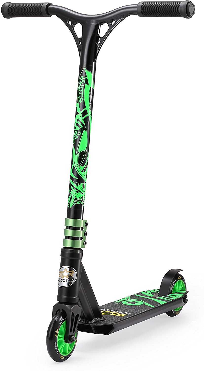 | Name | STAR SCOOTER Pro Sport Freestyle Stunt Scooter Kickscooter Roller Mini für Kinder ab 5 Jahre | 110mm Einsteiger/Fortgeschritten Stuntscooter Alu HIC Kompression | Schwarz & Grün |