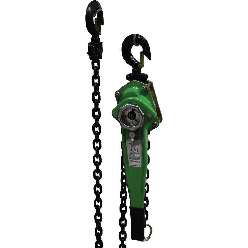 Dieses Werkzeug bietet eine robuste Bauweise, die durch ein gepresstes Gehäuse und ein Guss-Treibrad gekennzeichnet ist. Mit seiner hohen Stabilität der Öse und Ketten ermöglicht es zuverlässiges Arbeiten bei schweren Aufgaben wie dem Ziehen von Wurzelstöcken oder Betonpfählen. Die einfache Handhabung macht es zu einer praktischen Lösung für verschiedene Hebe- und Zuganwendungen.