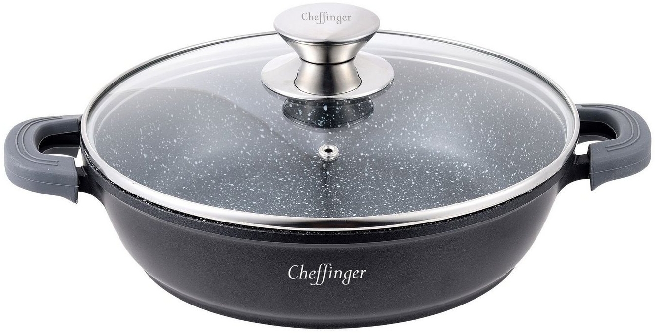 | Name | Cheffinger Schmorpfanne mit Glasdeckel, Aluguss schwarz, Ø 28 cm |
