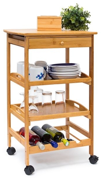 Der Küchenrollwagen JAMES L & Flaschenregal 10019166 vereint robuste Bauweise und praktisches Design. Er eignet sich ideal für den Transport von Geschirr, Flaschen und Gerichten und kann auch als Beistelltisch verwendet werden. Der Wagen besteht aus 100% Bambus und verfügt über eine Schublade, zwei herausnehmbare Holztabletts sowie ein Flaschenregal für bis zu vier Flaschen. Mit bremsbaren Rollen ist er flexibel einsetzbar. **Highlights** - Robuste Bauweise für langlebige Nutzung - Praktisches Design für einfachen Transport - Flaschenregal für bis zu 4 Flaschen - Schublade für zusätzlichen Stauraum - Bremsbare Rollen für hohe Mobilität **Produkteigenschaften** - Größe H x B x T: ca. 80,5 x 50 x 37 cm - Gewicht: ca. 4,7 kg - Maße der Tabletts: ca. 1 x 40 x 31 cm - Material: 100% Bambus, Schublade beklebtes MDF - Traglasten: obere Ablage 30 kg, Tablett je 10 kg, untere Ablage 10 kg **Lieferumfang** - 2x Seitenteile - 1x Weinregal - 2x Tabletts - 1x Schublade - 1x Ablage - 4x Rollen - Anleitung und Montagematerial - Dekorationsartikel sind im Lieferumfang nicht enthalten