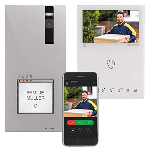 Die Comelit 8451V Einfamilienhauskit Quadra 1-4 WE Monitor Mini HF WiFi System 8451V bietet eine edle Optik, WLAN-Funktion für Benachrichtigungen und Kommunikation über die App. Die Installation wird als einfach empfunden, mit akzeptabler Bildqualität und einfacher Einrichtung der App.