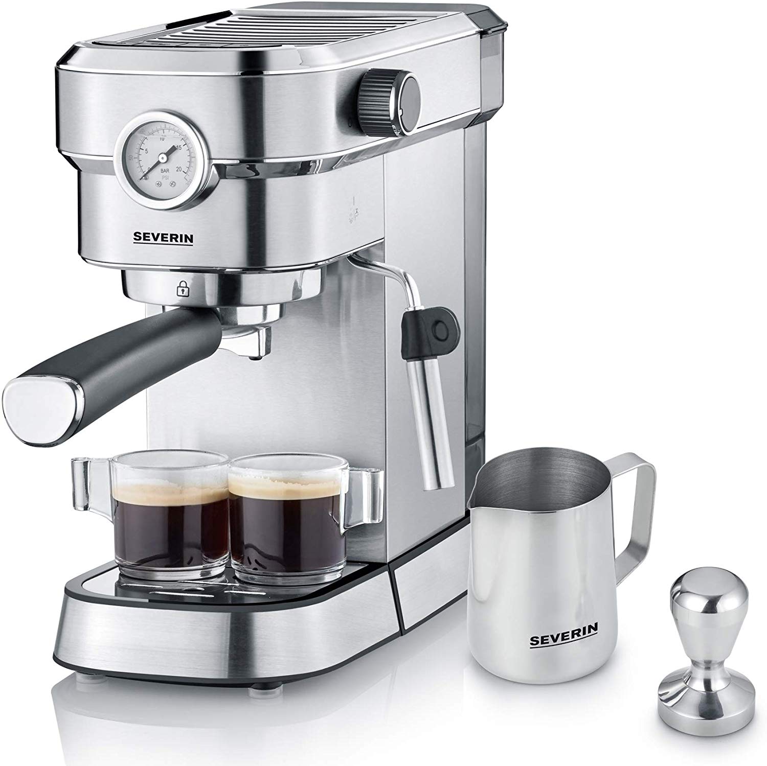 Die SEVERIN Espresa Plus Espressomaschine ermöglicht es, hochwertige Espresso-, Cappuccino- und Latte-Kreationen zu Hause zuzubereiten. Mit ihrem ansprechenden Design und den schmalen Abmessungen fügt sie sich harmonisch in jede Küche ein. Ein integriertes Barometer zur Kontrolle des Drucks sorgt für eine präzise Zubereitung der Kaffeegetränke. Der mitgelieferte Tamper erleichtert das Verdichten des Kaffeepulvers, während der geringe Reinigungsaufwand die Pflege des Geräts vereinfacht.