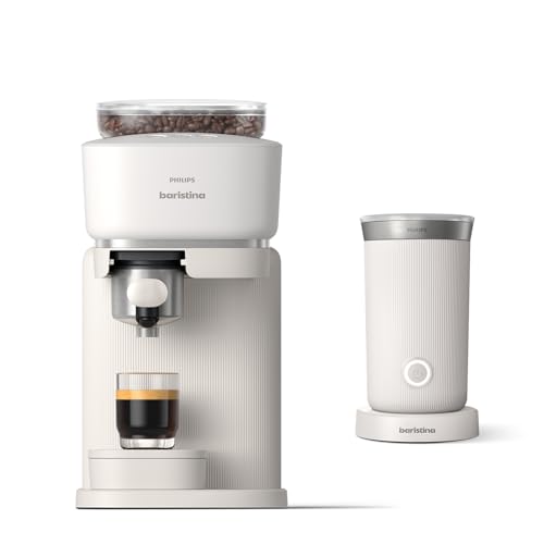 PHILIPS Baristina Espressomaschine und Milchaufschäumer Paket. Real Espresso- made simple. Naturweiß mit naturweißem Siebträger- 16-bar-Pumpendruck- automatisches Mahlwerk- Cafe Crema (BAR303/00)