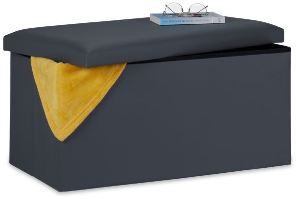 Die faltbare Relaxdays Sitzbank aus Kunstleder in Dunkelgrau bietet mit den Maßen 37,5 x 76,5 x 38,5 cm vielseitigen Stauraum für Flur, Wohn-, Schlaf- oder Kinderzimmer. Die gepolsterte Truhenbank ist ideal für Decken und Zeitschriften und lässt sich schnell aufbauen sowie platzsparend verstauen. **Highlights** - Vielseitige Truhenbank mit viel Stauraum - Gepolsterte Sitzfläche für angenehmes Sitzen - Platz für 2 Personen - Schnell aufgebaut und faltbar - Modernes Design in Dunkelgrau **Produkteigenschaften** - Maße: ca. 37,5 x 76,5 x 38,5 cm (H x B x T) - Innenraum: ca. 34 x 73 x 35 cm (H x B x T) - Volumen: ca. 84 Liter - Max. Traglast: ca. 100 kg - Gewicht: ca. 4,1 kg - Material: Kunstleder, MDF, Schaumstoff - Stabile Konstruktion - Abnehmbarer Deckel für zusätzlichen Stauraum **Lieferumfang** - 1x Flurbank in Dunkelgrau - Dekoartikel sind nicht im Lieferumfang enthalten