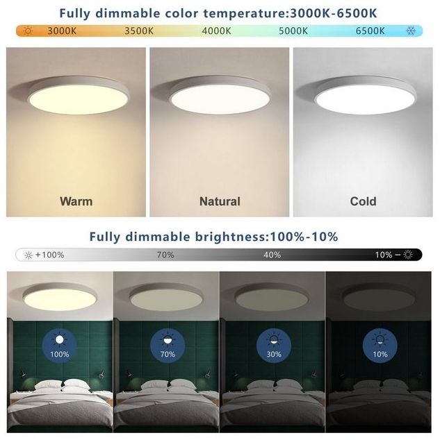 Die JDONG Deckenleuchte ist eine moderne, ultra dünne Deckenlampe mit einem Durchmesser von 50 cm und einer Höhe von nur 4 cm. Sie bietet eine dimmbare Lichttemperatur von 3000K bis 6500K und ist mit Amazon Alexa und Google Home kompatibel. Die Steuerung erfolgt bequem per Fernbedienung oder über die Smart Life App. Ideal für Flure, Wohnzimmer, Schlafzimmer und Büros, sorgt sie für ein gleichmäßiges und angenehmes Licht. **Highlights** - Kompatibel mit Amazon Alexa und Google Home für Sprachsteuerung - Dimmbar von 3000K bis 6500K für individuelle Lichtstimmungen - Ultra dünnes Design mit nur 4 cm Höhe - Speicherfunktion für einfache Lichtwiedereinstellung - Hochwertige Materialien für gleichmäßiges, blendfreies Licht **Produkteigenschaften** - Maße (ØxH): 50x4 cm - Leistung: 54 W - Lichtfarbe: 3000K-6500K - Material: Eisen / Acryl - Einsatzbereiche: Schlafzimmer, Wohnzimmer, Küche, Büro