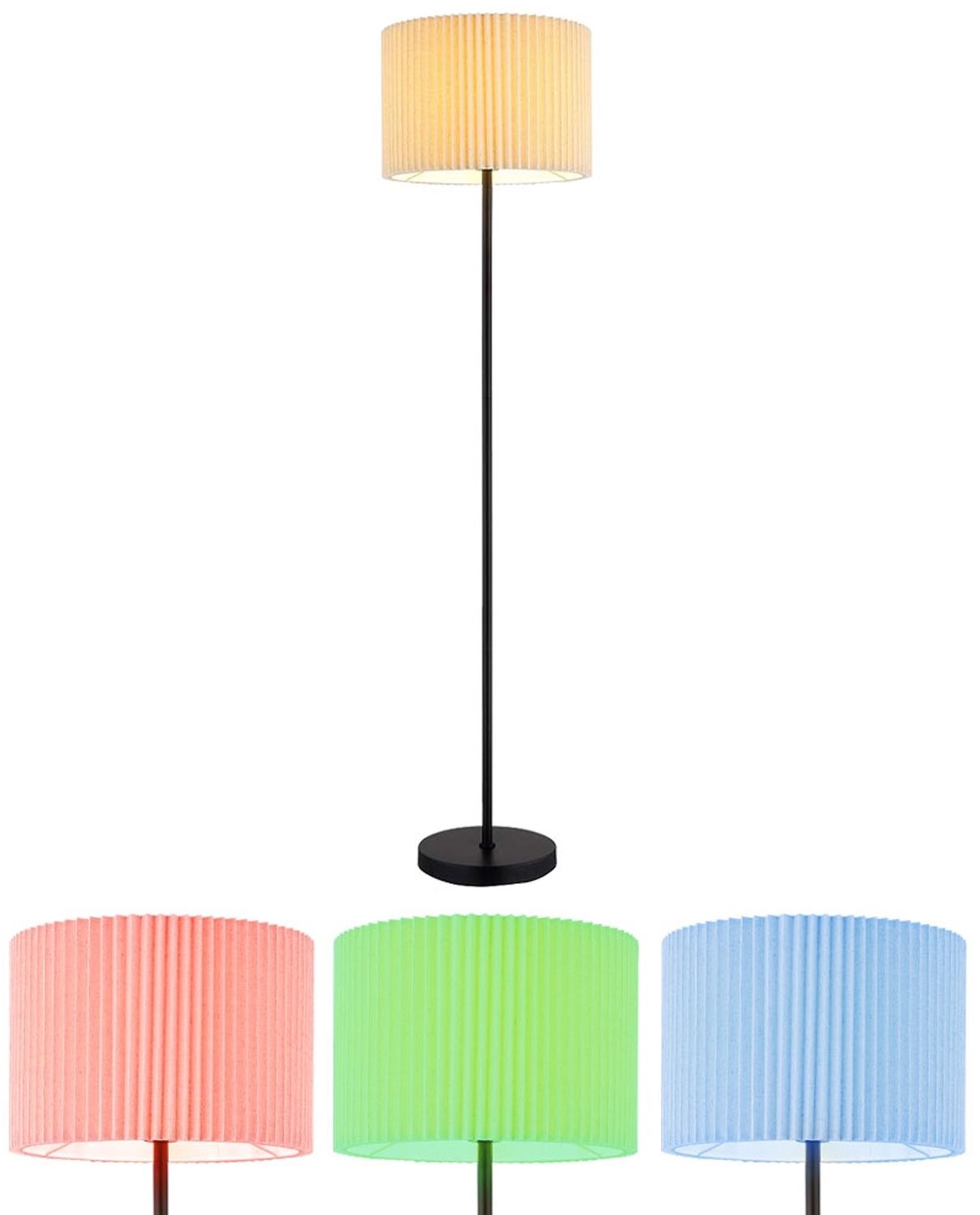 **Beschreibung** Die Stehleuchte kombiniert traditionelles Design mit moderner Eleganz und ist ein echter Blickfang in jedem Raum. Der runde, zylindrische Textilschirm mit feinen Falten in naturfarbenem Textil sorgt für eine angenehme, diffuse Lichtverteilung, die eine behagliche Atmosphäre schafft. Der Korpus aus schwarzem, mattem Metall verleiht der Leuchte eine zeitlose und edle Ausstrahlung. Mit einem Durchmesser von 38 cm passt die Stehleuchte perfekt in unterschiedlichste Wohnräume und fügt sich harmonisch in moderne sowie klassische Einrichtungsstile ein. Der Fußtrittschalter im Kabel ermöglicht eine bequeme Bedienung, sodass Sie die Leuchte ganz einfach ein- oder ausschalten können. Die Stehleuchte ist mit einer E27-Fassung ausgestattet, die eine individuelle Auswahl der Leuchtmittel ermöglicht. Diese Leuchte eignet sich ideal für Wohnzimmer, Schlafzimmer oder Flure und bietet sowohl funktionale als auch ästhetische Beleuchtung. Dank des beigelegten Leuchtmittels können Sie die Lampe bequem von der Couch aus über die App- oder Sprachsteuerung bedienen. Über die App können Sie den Timer mit verschiedenen Wochentagen und Uhrzeiten, sowie verschiedene Leuchtprogramme einstellen. Ein Smart RGB LED Leuchtmittel ist im Lieferumfang enthalten. **Details Leuchte** • Lampentyp: Stehleuchte • Material: Metall, Textil • Farbe: naturfarben, schwarz • Schutzart: IP20 • Schutzklasse: 2 • Fußschalter • Kabellänge in cm: 180 • Schirm Höhe in cm: 26 • Sockel Durchmesser in cm: 25,4 • Durchmesser x Höhe in cm: 38 x 152 • Fassung: 1x E27 • Leuchtmittel enthalten • Leistung Leuchtmittel: 1x 5 Watt • Lichtstrom: 1x 470 Lumen • Lichtfarbe: warmweiß-kaltweiß + RGB-Farbmodus • Spannung: 230V, 50Hz **Details Leuchtmittel** • Leuchtmitteltyp: RGB-LED Smart-Home • Sockel: E27 • Material: Metall silber, Kunststoff • Lichtfarbe: warmweiß-kaltweiß + RGB-Farbmodus • Schutzart: IP20 • Lichtstrom: 470 lm (Lumen) • Energieverbrauch: 5 kWh/1000h • Farbtemperatur: 2700-6400 K (Kelvin) • Lichtfarbe: warmweiß, neutralweiß, kaltweiß +RGB Farbmodus • Ra > 80 • Nennleistungsaufnahme: 5 W (Watt) • Nennlebensdauer: 30.000 h (Stunden) • Schaltzyklen: 15.000x • Betriebsspannung: 220-240 V (Volt) • Netzfrequenz: 50 Hz (Hertz) • Quecksilbergehalt : 0 mg (Milligramm) • Vergleich zu normale Glühbirne: 4,5W - 28W • Umgebungstemperatur:-20°C bis +45°C • dimmbar: Ja • Verwendung mit Sensor/Timer möglich: ja • Nomineller Halbwertswinkel: 180° (Grad) • Durchmesser x Höhe in mm: 45 x 81 • Anlaufzeit bis 100%: <1 Sek. (Sekunden) **Steuerbar per App (Handy, Tablet, etc.)** • kompatible Betriebssysteme: IOS, Android • Sprachsteuerung über Amazon Alexa • Weißlicht-Steuerung: warmweiß, neutralweiß, kaltweiß • Memory Funktion • Timer (verschiedene Tage und Zeiten programmierbar) • verschiedene Szenemodi einstellbar **Achtung! Die Installation kann nur auf der Wlan-Frequenz 2,4GHz durchgeführt werden, dafür ist es ggf. notwendig die Wlan-Frequenz 5GHz für die Dauer der Installation, über den Router, zu deaktivieren.**