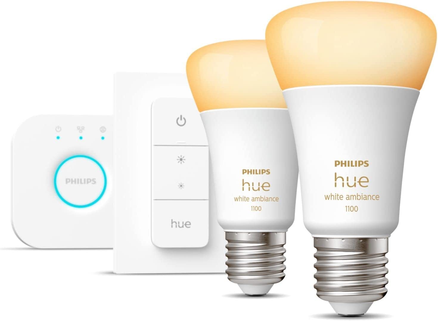 | Lieferumfang | 2x Leuchtmittel, 1x Philips Hue Bridge, 1x Dimmschalter, 1x Netzteil, 1x Netzwerkkabel |