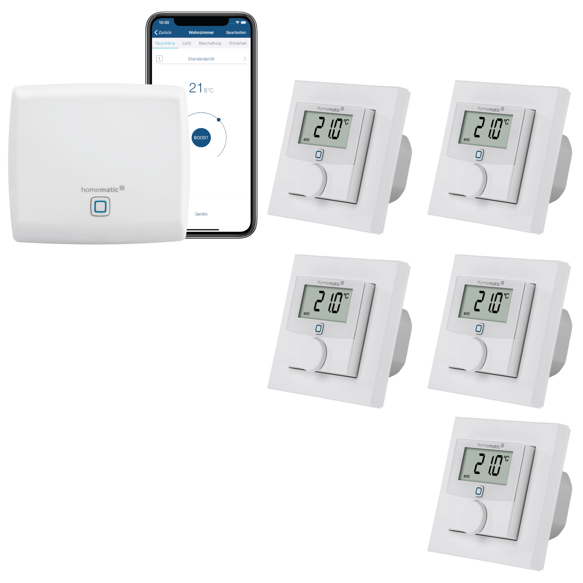 | Anzahl Heizkörperthermostate | 5 | 1 | 1 | 1 | 1 | 1 Stück | - | - | 1 | Bis zu drei individuell einstellbare Heizprofile | 1 | 1 | 1 | 1 | 1 Stück | 1 | 1 Stück | 1 | 1 | 1 Heizkörperthermostat | 1 |