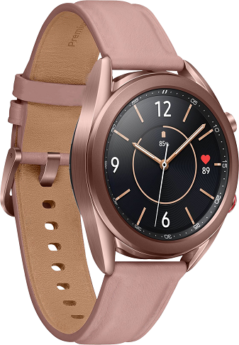 Die Samsung Galaxy Watch 3 LTE ist eine Smartwatch für Damen, die mobile Produktivität mit fortschrittlicher Fitnesstechnologie in einem stilvollen und klassischen Gehäuse vereint. Mit einem Durchmesser von 41 mm und einem edlen Bronzefinish ist sie sowohl im Büro als auch in der Freizeit ein ansprechender Begleiter. Ihre drehbare Lünette ermöglicht eine präzise Navigation durch Apps, während das SAMOLED-Display mit einer Auflösung von 360 x 360 Pixel jederzeit klare Sicht bietet.