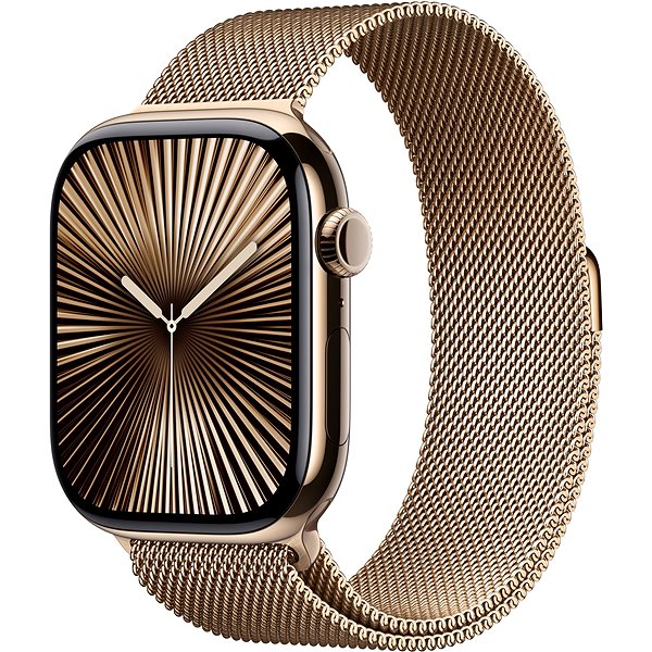 • Die Apple Watch Series 10 verfügt über ein 46 mm großes Titangehäuse in Gold, das für eine elegante und robuste Erscheinung sorgt.