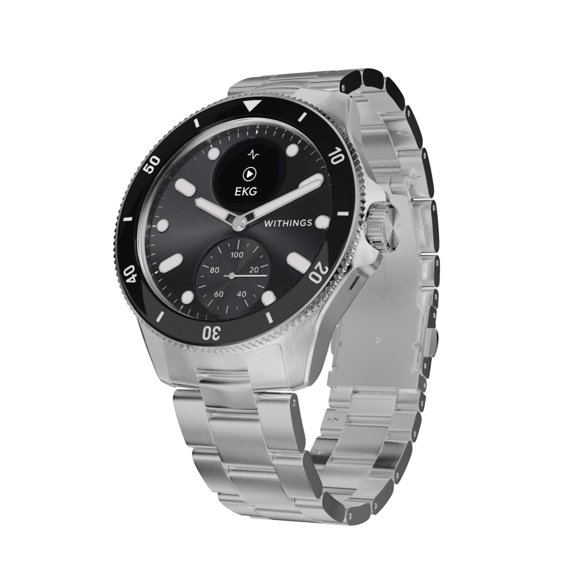 Die Withings ScanWatch Nova besticht durch ihr elegantes Design im Taucherstil. Ihr Gehäuse aus Edelstahl und das Saphirglas verleihen der Uhr nicht nur ein hochwertiges Aussehen, sondern sorgen auch für eine hohe Langlebigkeit. Das Sonnenschliff-Zifferblatt mit Super-LumiNova-Indizes und -Zeigern ermöglicht eine gute Ablesbarkeit bei schwachem Licht. Mit einer Wasserdichtigkeit von bis zu 100 m (10 ATM) eignet sich die Uhr ideal für Schwimmer und Taucher. Das Oyster-Metallarmband sorgt für einen sicheren Sitz, kann jedoch von einigen Nutzern als unhandlich beschrieben werden (TechRadar).