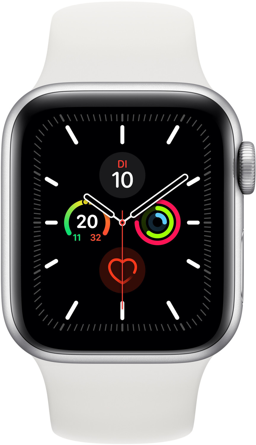 Die Apple Watch Series 5 kommt in einem eleganten Aluminium-Gehäuse mit einem silbernen Finish und einem weißen Kunststoffarmband. Mit einem Gewicht von lediglich 36,7 g ist sie angenehm zu tragen, auch über längere Zeiträume. Das LTPO OLED Retina Display mit einer Auflösung von 368 x 448 Pixel sorgt für eine klare Darstellung, während das Ion-X Glas für Schutz vor Kratzern sorgt. Die Uhr ist wasserdicht und hat eine IP-Schutzart von 5 ATM, was sie für den Alltag und sportliche Aktivitäten geeignet macht.