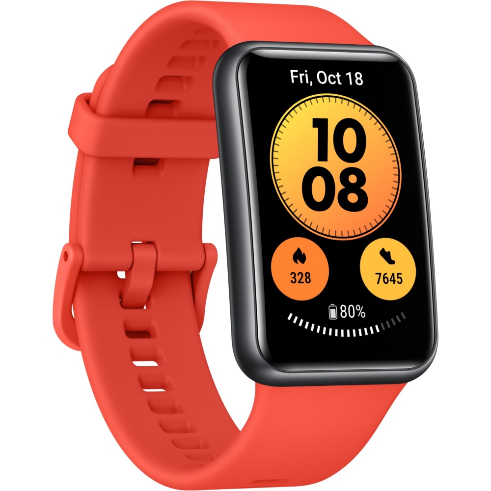 Die Huawei Watch Fit new zeichnet sich durch ihr elegantes und unisex-freundliches Design in der Farbe Pomelo Red aus. Mit den Abmessungen von 46 x 30 mm und einem Gewicht von lediglich 21 g ist sie sowohl leicht als auch angenehm zu tragen. Das Silikonarmband ist für Handgelenke mit einem Umfang von 130 bis 210 mm geeignet, was die Smartwatch für eine breite Zielgruppe zugänglich macht. Die 2.5D-Glasoberfläche des Displays schützt vor Kratzern und sorgt für eine klare Sicht.
